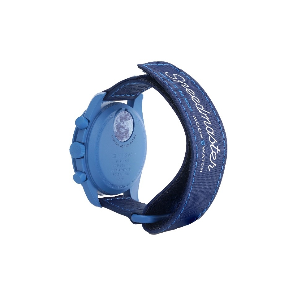 夏の季節と2024年8月20日のブルームーンを祝うこのクロノグラフは、ブルーのBioceramic製ケースとクラウン、プッシャー、そしてライトブルーの対比ステッチとブルーBioceramic製ループが付いたブルーのVELCRO®ストラップが特徴です。ブルーとシルバーオパーリンのパンダダイヤルにはブルーの針とアワーマーカーが付いています。Bioceramic MoonSwatchコレクションの他のモデルとは異なり、ブルーBioceramic製ベゼルは、ホワイトのマーカーが付いたパルスメータースケールを備えています。このモデルは、時計のあらゆるコンプリケーションの中で最も詩的と言ってもいいムーンフェイズ機能を備えていることで際立っています。2時位置のサブダイヤルの中で回転するダークブルーのムーンフェイズディスクを背景に、2つの特大サイズのブルームーンが描かれています。紫外線が当たると、ムーンフェイズマスクとディスクに秘密のディテールが現われます。電池カバーには、さまざまなブルーの色合いの月が見られます。コレクションのすべての文字盤には、OMEGA X Swatchの文字、アイコニックなSpeedmasterのロゴ、そしてMoonSwatchのロゴが見られます。ボックス型バイオ由来素材グラス構造、グラス中央にはSwatchのロゴを参照した「S」のエッチング加工、文字盤の外側のリングと凹型のサブダイヤルには繊細で洗練された円の模様、シャープでスムーズなラグ構造、そしてもちろんユニークなBioceramicのタッチ。これらが全モデルに共通です。インデックス、時針と分針、そしてクロノグラフの秒針は、グレード A Super-LumiNova®により、暗闇でも完璧に光ります。
